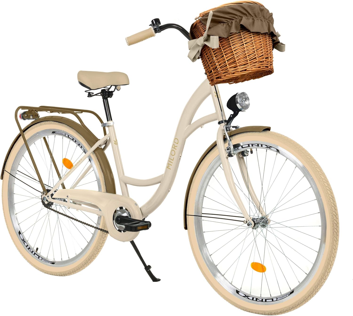 MILORD. Vélo Confort Brun crémeux à 1 Vitesse de 26 Pouces avec Panier et Porte-Bagages arrière, vélo néerlandais, vélo pour Femme, vélo de Ville, rétro, Vintage